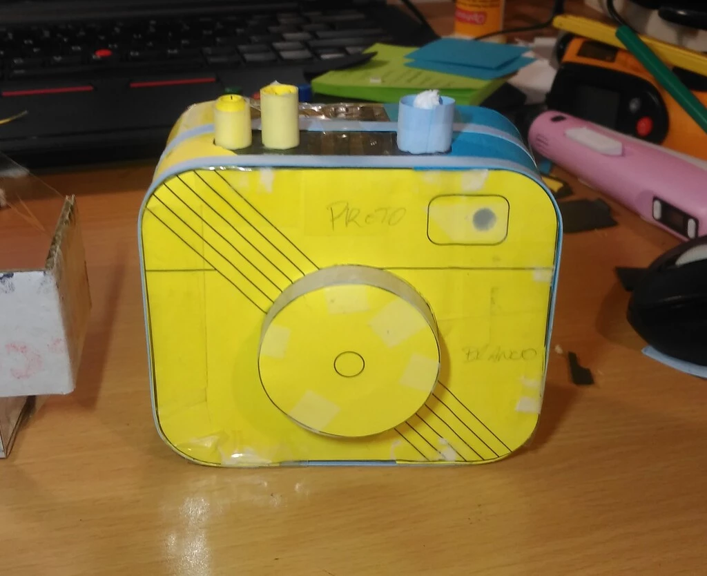 O case foi feito usando um método novo: caneta 3D e filamento PLA. Varias cores foram usadas e fim de replicar uma aparência "retro", inspirada na logo antigo do Instagram (RIP).